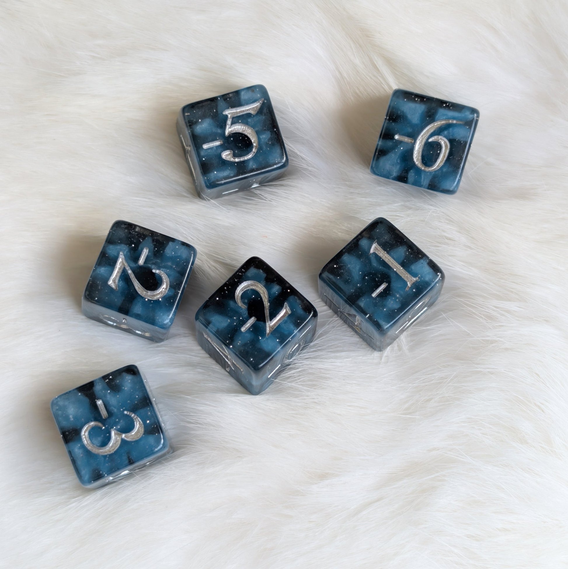 The Mystic Mind 6 D6 Negative Counters bring the quiet power of thought and shadow to your counter tracking needs. Each die is forged from black-tinted clear resin infused with silver glitter and swirling mica-blue clouds that resemble living thought, forming organic, brain-like textures. Numbered with negative values (-1/-1 or similar), these dice are perfect for tracking debuffs, penalties, or negative effects.