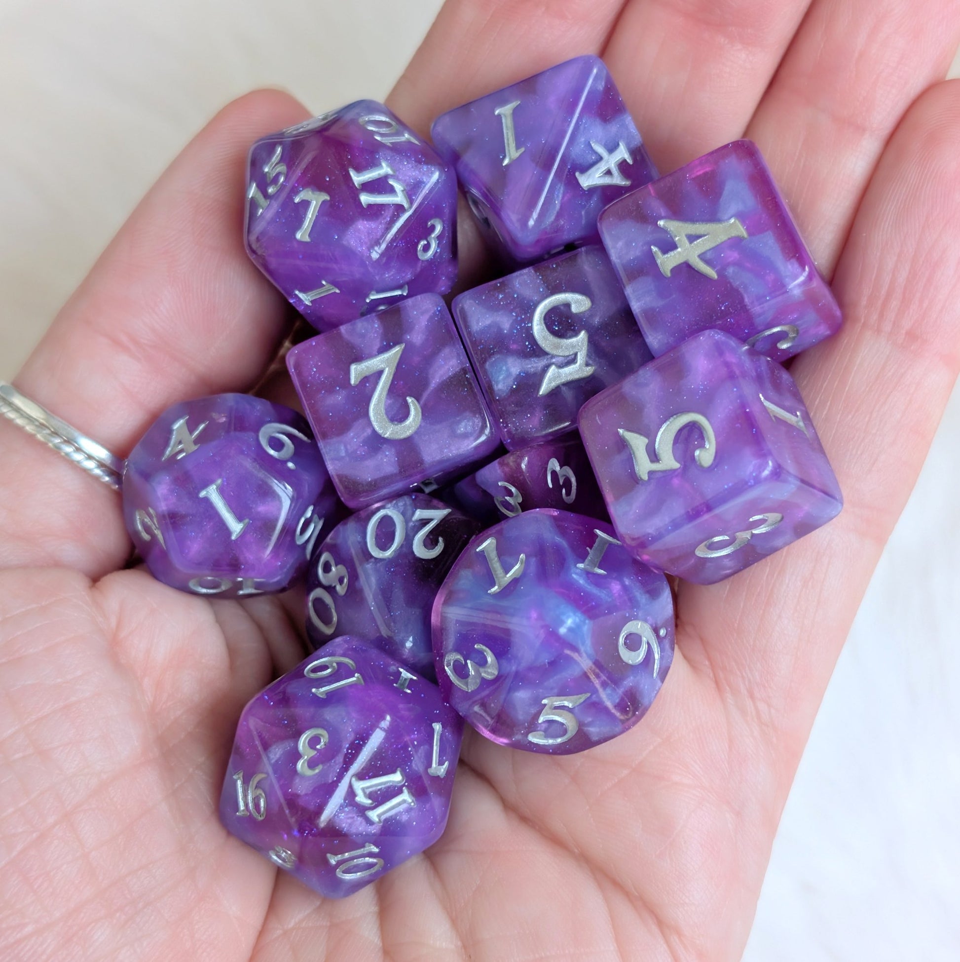 The Witch Bolt 11-piece dice set delivers everything you need for complex spellcasting and damage calculations. Swirling clouds of purple pearly mica powder drift through crystal-clear fuchsia-tinted resin like magical lightning frozen mid-strike, while shimmering glitter catches the light with every roll, evoking the sustained arc of energy that connects caster to target.